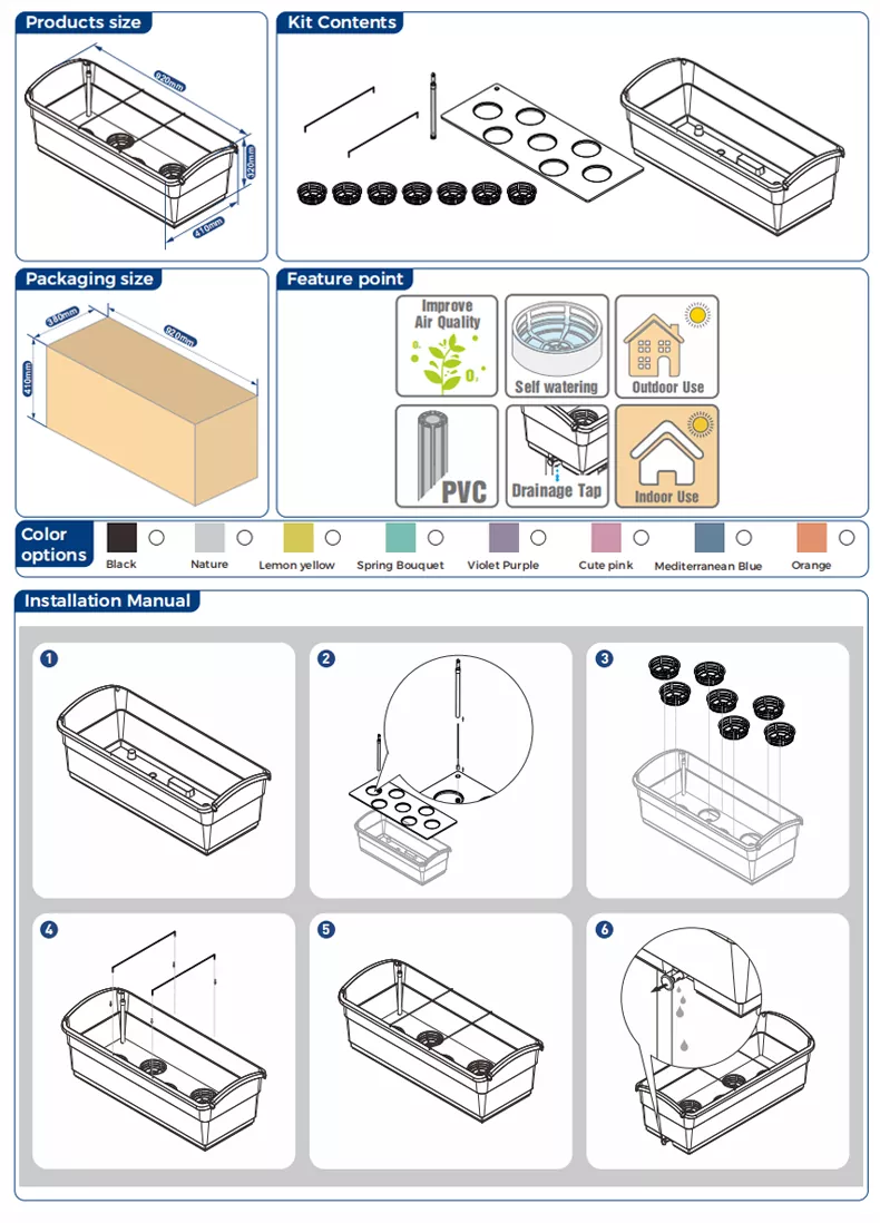 এই 30L সেল্ফ ওয়াটারিং প্ল্যানারটি শাকসবজি, সবুজ গাছপালা এবং ফুল চাষের জন্য উপযুক্ত। এটি জলের স্তর নিরীক্ষণের জন্য একটি জল স্তর পরিমাপক দিয়ে সজ্জিত। যখন জলের স্তর সর্বাধিক মান অতিক্রম করে, তখন আপনাকে পাত্র থেকে জল নিষ্কাশন করতে হবে। পাত্রের পাশে একটি নিষ্কাশন ভালভ আছে। এটি বন্ধ করতে এটি ভিতরের দিকে ধাক্কা দিন এবং জল নিষ্কাশনের জন্য এটিকে বাইরের দিকে টানুন। এই পাত্র ভিতরে এবং বাইরে উভয় ব্যবহার করা যেতে পারে। বাইরে এটি ব্যবহার করার সময়, বৃষ্টির কারণে পাত্রে জল জমতে না দেওয়ার জন্য ড্রেনেজ ভালভটি খুলতে ভুলবেন না।