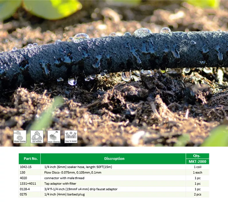 DIY সোকার পায়ের পাতার মোজাবিশেষ স্টার্টার কিট MKT-2000 1, সহজেই একটি দক্ষ এবং সুবিধাজনক জল তৈরি করুন আপনার বাগানের জন্য সিস্টেম 2, সোকার পায়ের পাতার মোজাবিশেষ 70% পর্যন্ত বেশি জল সংরক্ষণ করে, সংরক্ষণ করে আপনি অর্থ এবং আমাদের প্রাকৃতিক সম্পদ বজায় রাখতে সাহায্য 3, একটি ভেজানো পায়ের পাতার মোজাবিশেষ সেচ সেট আপ করতে আপনার যা প্রয়োজন তা ধারণ করুন সিস্টেম