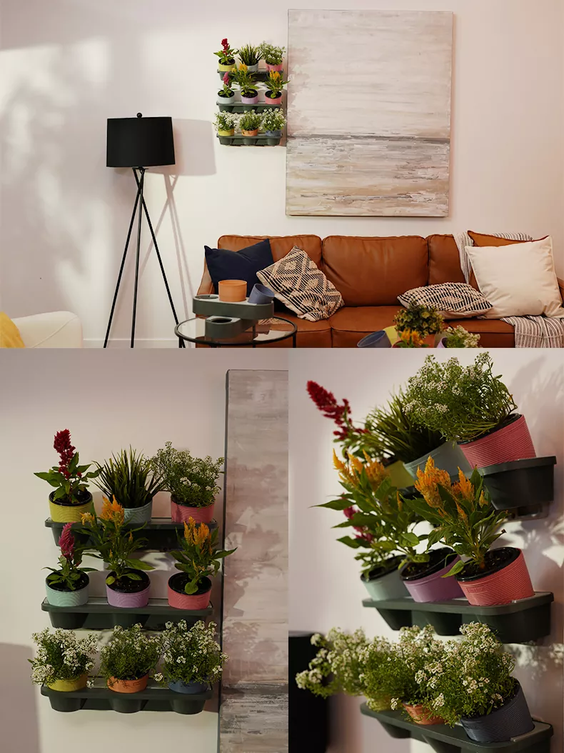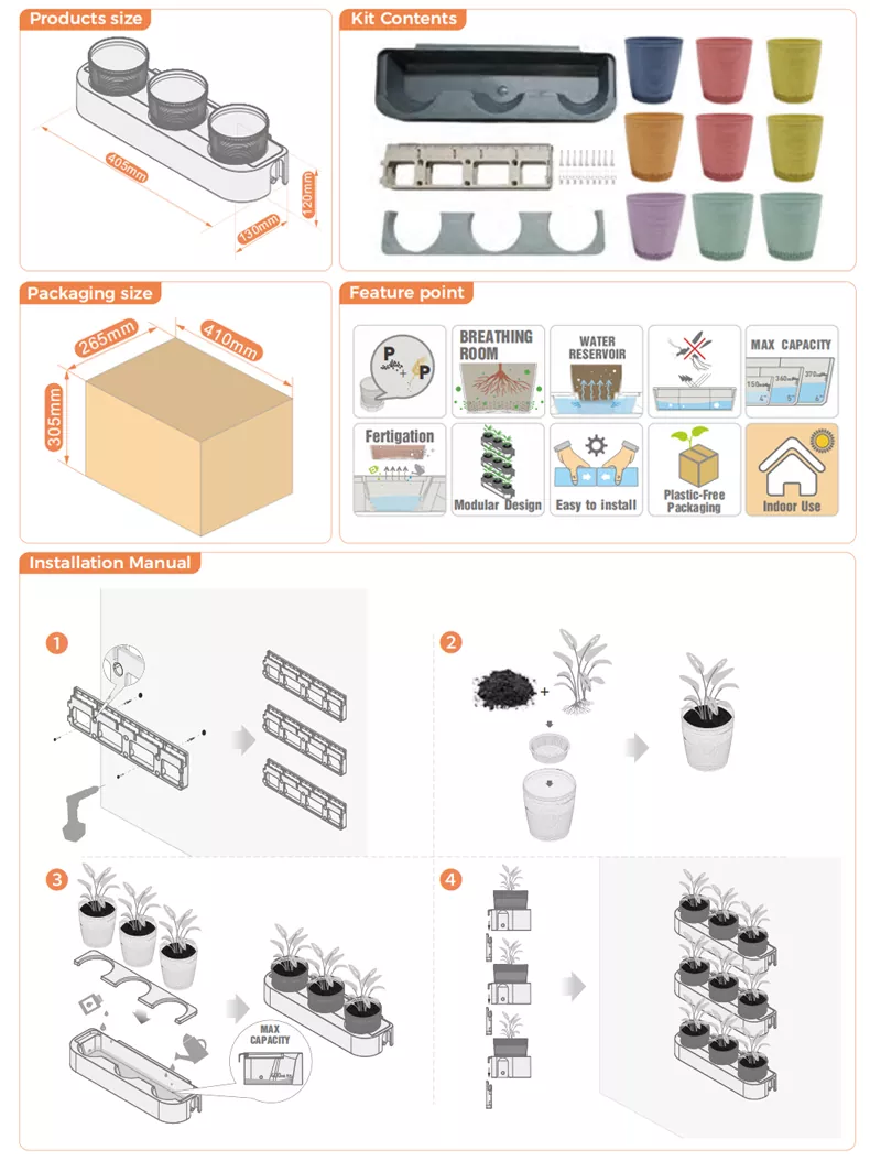 ইকো গার্ডেনিং ভার্টিক্যাল গার্ডেন ফ্লাওয়ার পট তিনটি ঝুলন্ত স্ট্রিপ, তিনটি জল সংরক্ষণের ঝুলন্ত পাত্র এবং নয়টি 4’’ ফুলের পাত্রের সমন্বয়ে গঠিত।