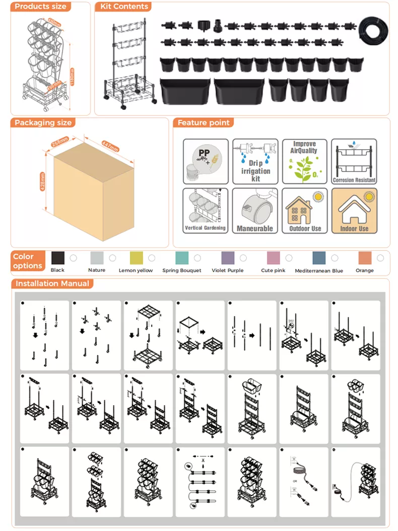 শহুরে জীবনযাপনের জন্য একটি নিখুঁত উপযুক্ত, আমাদের মেটাল মোবাইল গ্রিন ওয়াল ডাবল ফ্রেম আপনার সমস্ত শহুরে বাগানের প্রয়োজনের জন্য আপনার বন্ধু। একটি সম্পূর্ণ সেচ ব্যবস্থা সহ এই মাল্টি লেভেল প্ল্যান্টারের বহনযোগ্যতা এটিকে স্থান সংরক্ষণের বাগান করার জন্য আদর্শ করে তোলে। আপনার প্রিয় ভেষজ, শাকসবজি বা ফুল বাড়ান বা আপনার বাড়ির বাতাস পরিষ্কার করার জন্য কিছু বায়ু বিশুদ্ধকারী উদ্ভিদ যোগ করুন এবং আপনি যেখানেই যান সেখানে নিয়ে যান।