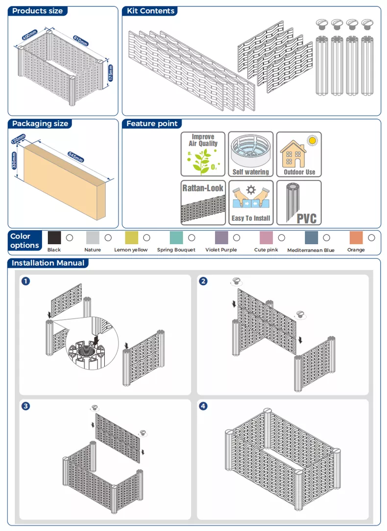 প্রতিটি আয়তক্ষেত্রাকার ইমোলর্যাটান প্লাস্টিকের বাগানের বিছানা একটি বিশদ চিত্রিত সমাবেশ নির্দেশিকা ম্যানুয়াল সহ আসে, যা প্রতিটি উপাদানের ইনস্টলেশন পদক্ষেপ এবং সতর্কতাগুলি স্পষ্টভাবে চিহ্নিত করে। সমাবেশ প্রক্রিয়া চলাকালীন আপনি যদি কোনো প্রশ্নের সম্মুখীন হন, আপনি অনলাইন গ্রাহক পরিষেবা, অফিসিয়াল হটলাইন বা অন্যান্য চ্যানেলের মাধ্যমে যে কোনো সময়ে আমাদের সাথে যোগাযোগ করতে পারেন, আপনি সুচারুভাবে ইনস্টলেশন সম্পূর্ণ করেছেন তা নিশ্চিত করতে আমরা একের পর এক ভিডিও বা পাঠ্য নির্দেশিকা প্রদান করব।